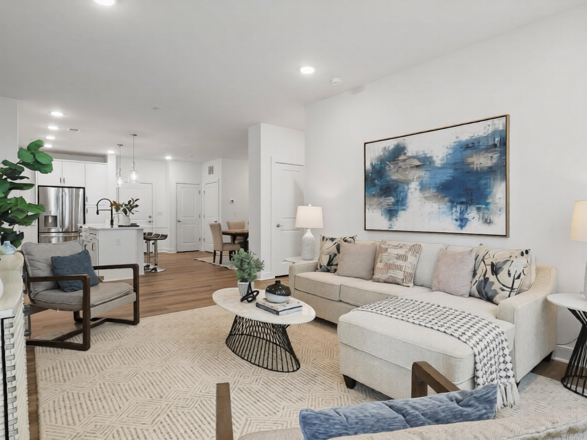 Services include expert design planning, delivery, installation, full staging of designated spaces, and removal (destaging), using curated furniture, artwork, décor, accessories, rugs, and decorative lighting.